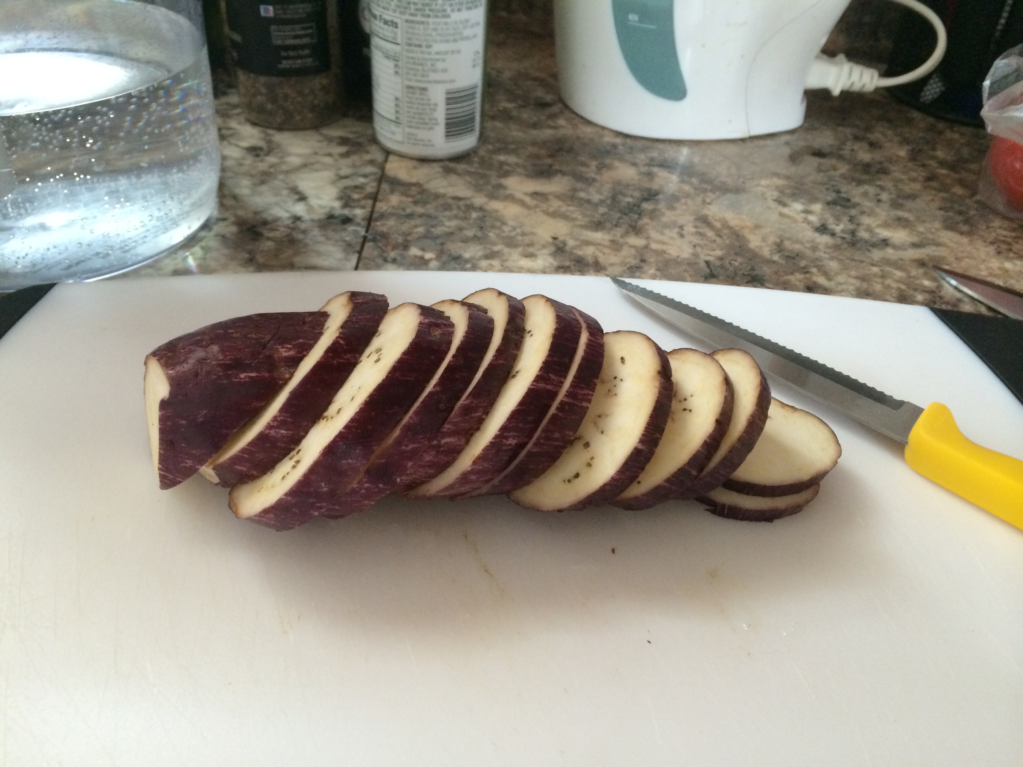 1. Wash the eggplant and portabella mushroom cap and cut into thin slices.