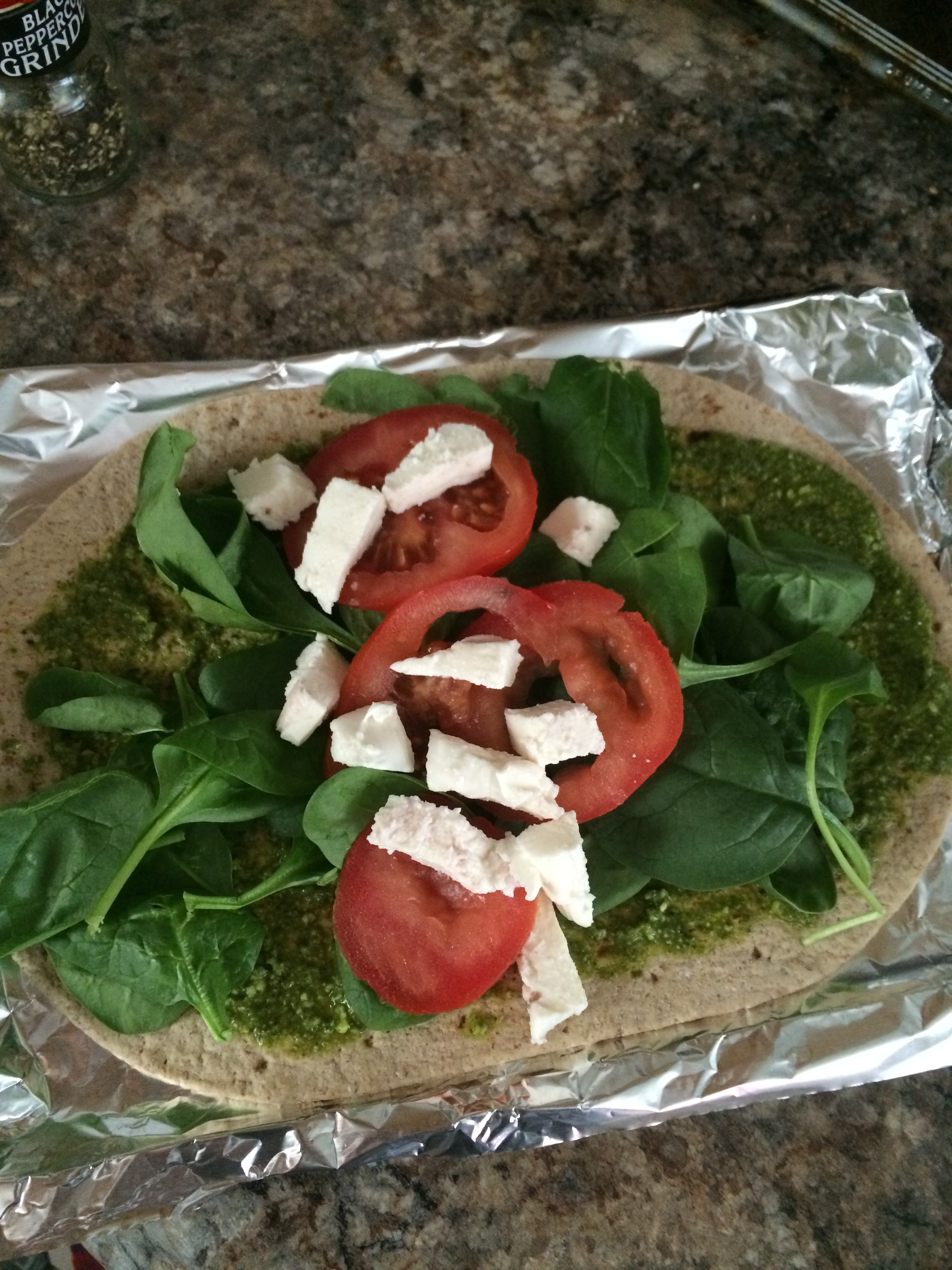 3. Lay flatbread on tin foil on a small toaster oven tray. Spread two tablespoons of pesto sauce on the flatbread.