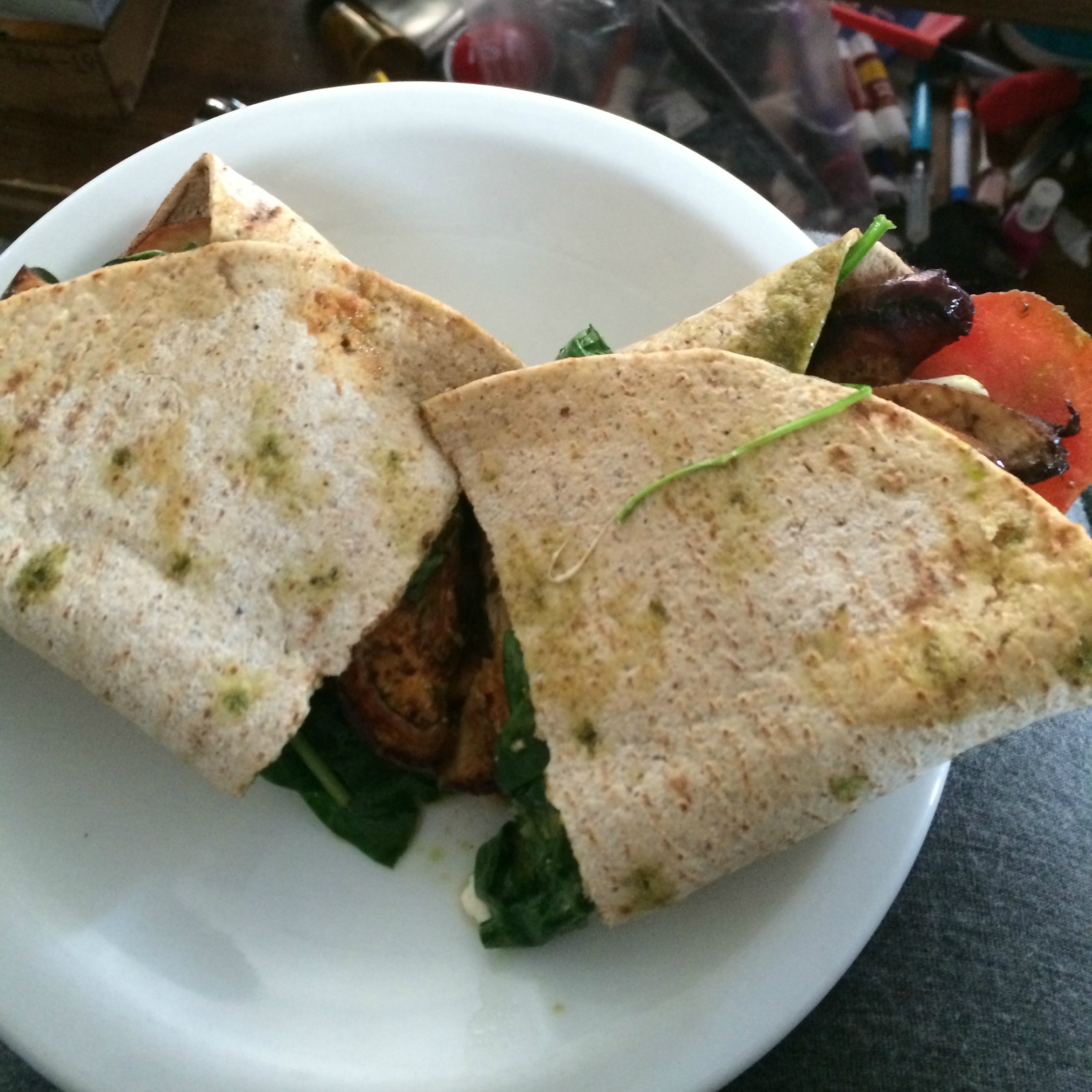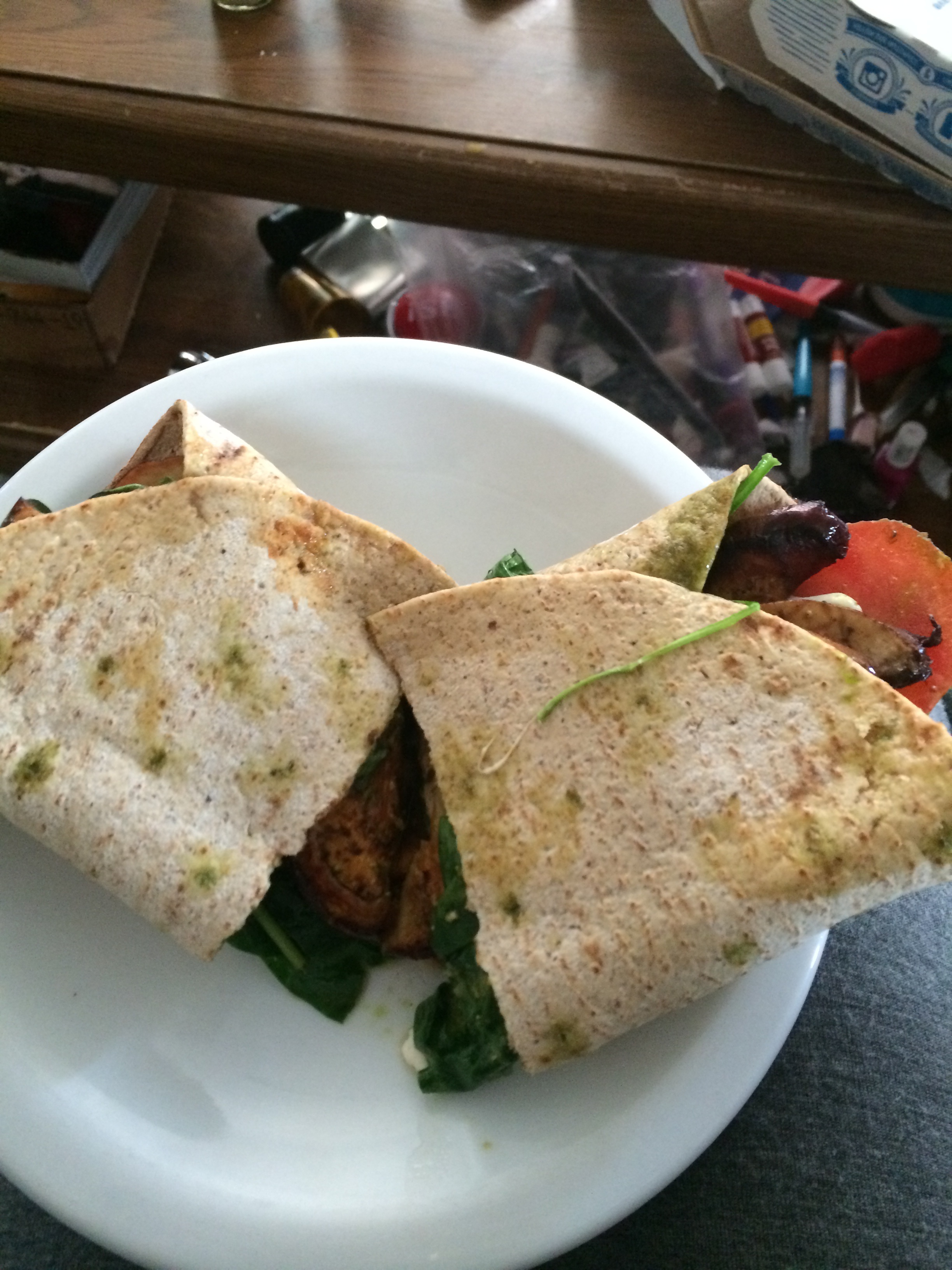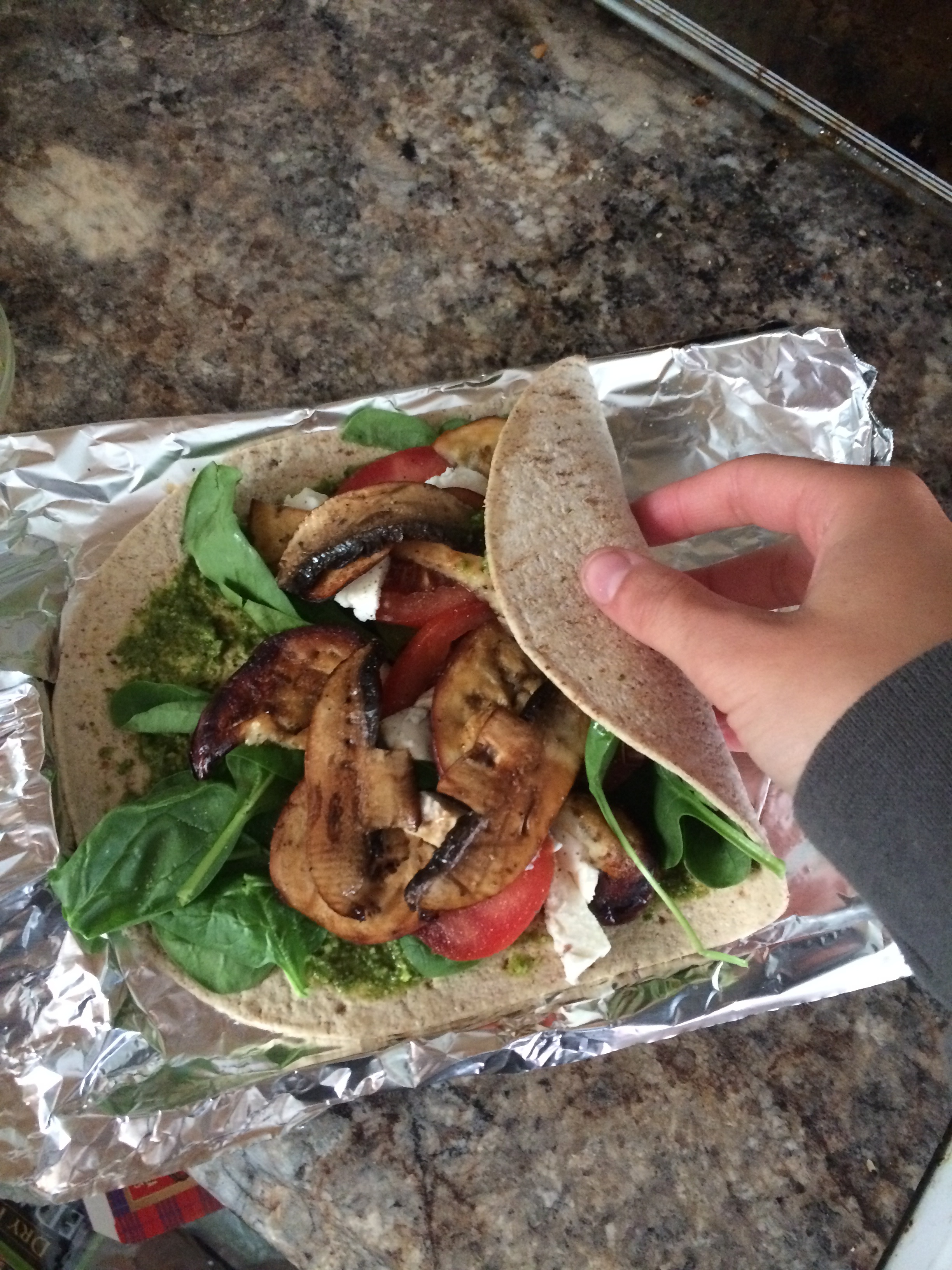 5. Collect the cooked eggplant and mushroom from the skillets and add on top of rest of the ingredients on the wrap. Sprinkle salt and pepper to taste. Wrap the flatbread. Everything should still be on the toaster-oven tray.