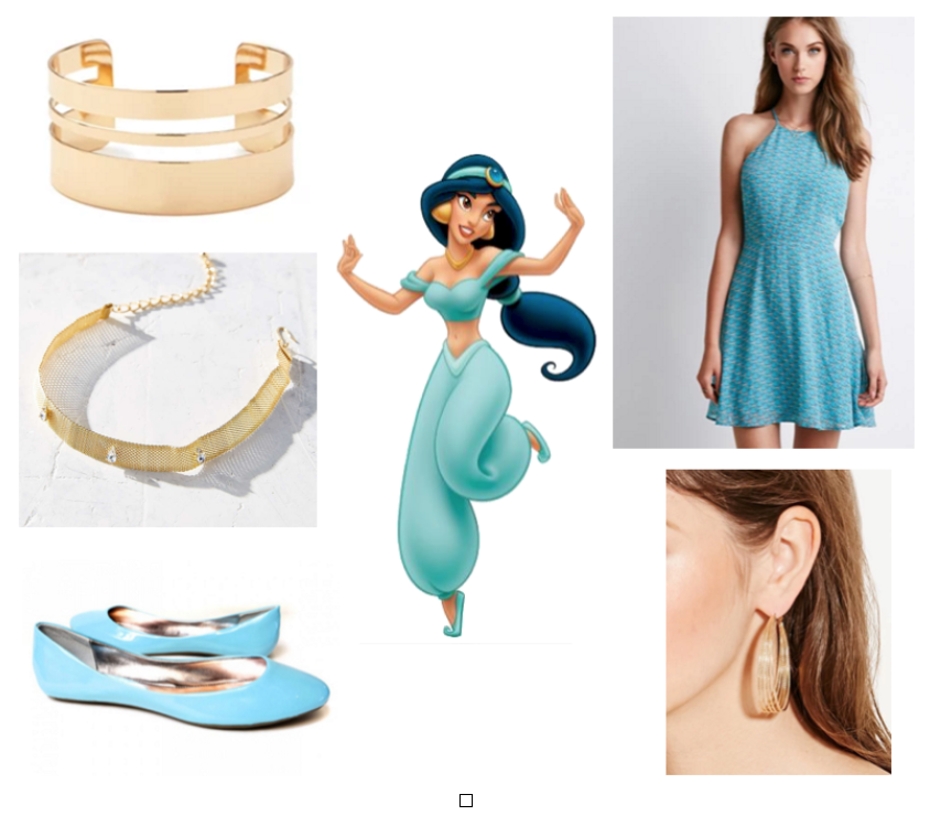 Heat up the summer with this Jasmine-inspired outfit! Combining a sleeveless turquoise dress with gold jewelry will achieve this look. Thick gold jewelry is ideal, as Jasmine has similar gold earrings and necklace. Adding several bangles, a common accessory in the Middle East, also make this outfit pop. To keep this on point, pair matching flats to complement the dress. This look is super cute, fun and great to wear for any Arabian night.