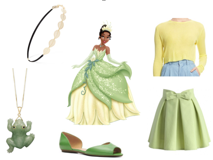 Straight from New Orleans is an outfit that commemorates one of Disney’s newer princesses, Princess Tiana. The colors in this two-piece set are bright, cheerful and natural, making it a wonderful spring and summer ensemble. The skirt and sweater are green and yellow to reflect the dress that Tiana wore in the movie. A green flat in the same or a complementary color work best, but a small heel could also work. As for accessories, frogs were a major theme in the movie, so a cute frog necklace against the yellow sweater is a great choice. Tiana spent most of the movie in the marshlands of the bayou, so a leafy or flowered headband also would be a stylish accessory. This outfit is simple yet elegant, and is guaranteed to be a winning look for any occasion.