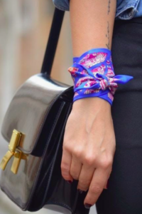 Instead of a bracelet, opt for a silk scarf to create a softer, girly vibe. Again, this is an easy way to add some color or a pattern to your outfit. Tie the silk scarf in a bow or knot around your wrist.