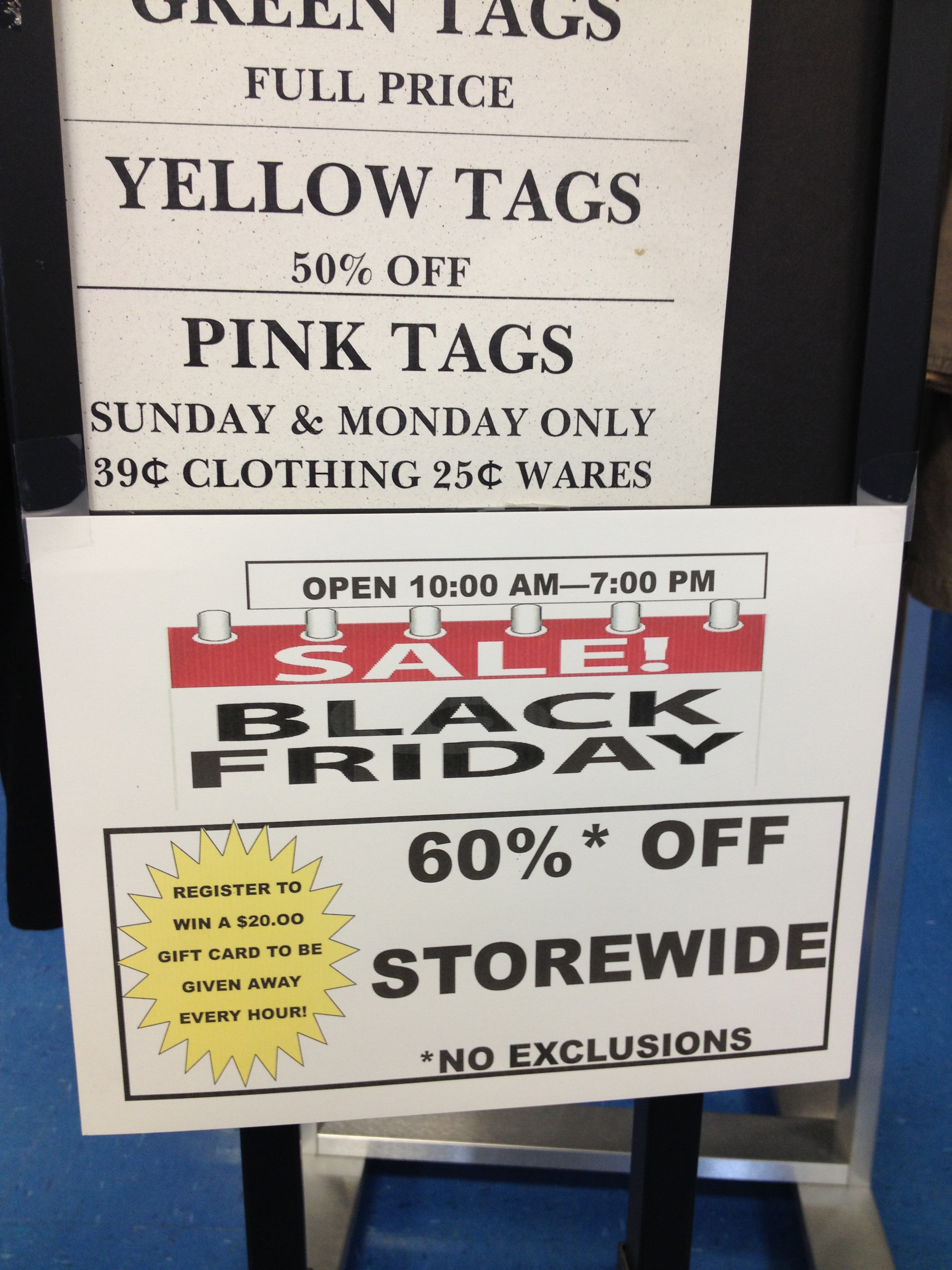 The entire store was 60 percent off. How could I just let that incredible sale slip through my fingers? I was also just curious as to what a thrift store would be like on Black Friday. I mean, how many people (other than me) are going to put an already insanely cheap second-hand store on their list of Black Friday priorities?