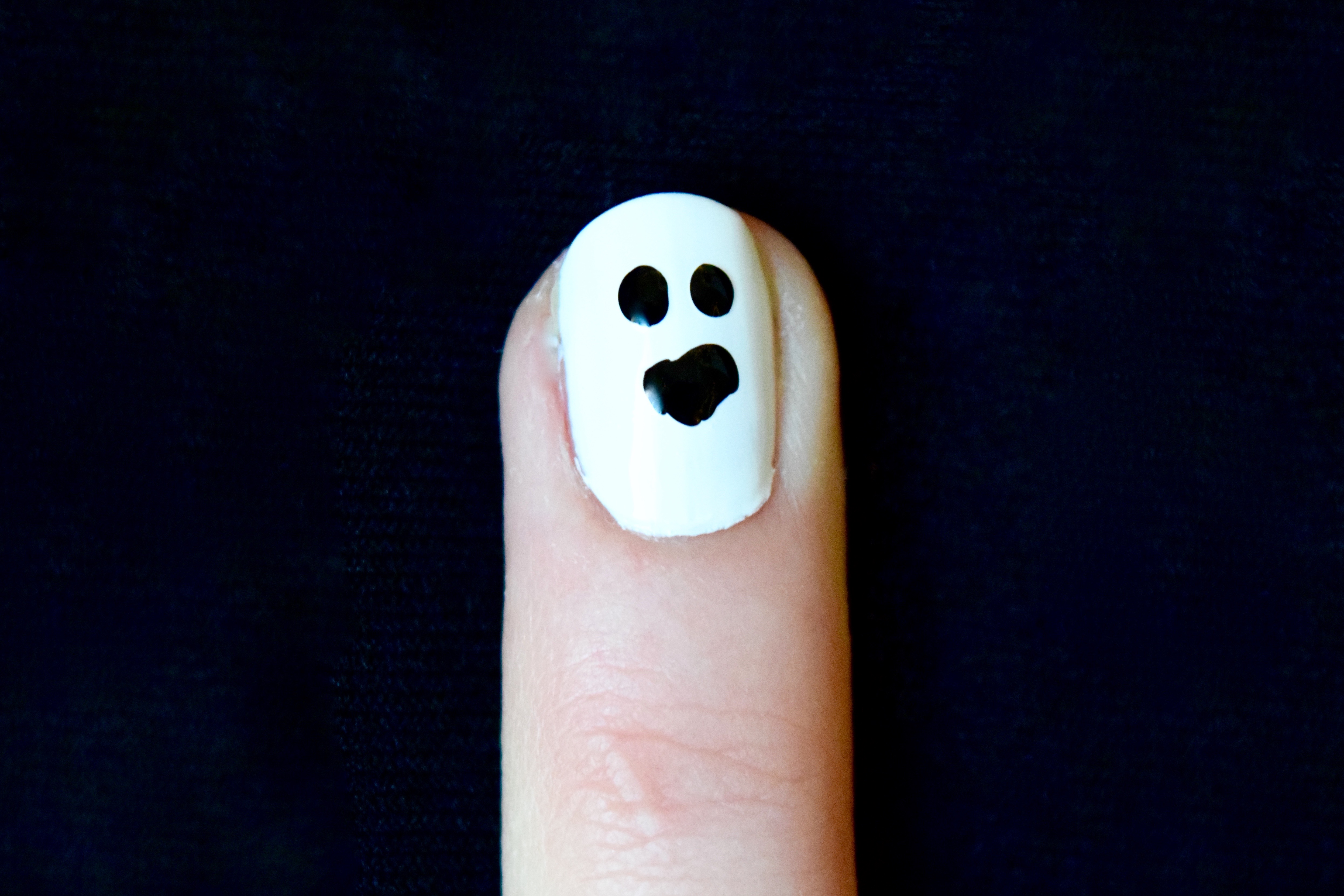 For this design you will need white and black nail polish. Begin by brushing a layer of white paint across the entire nail. You may need to add more layers to get an opaque white like the one shown above. Once the white paint has dried, use your black polish to drip some eyes and a mouth onto the middle of the nail. That’s it! If you’re feeling adventurous you can switch out the white paint for orange and whip up some tiny jack-o-lanterns.