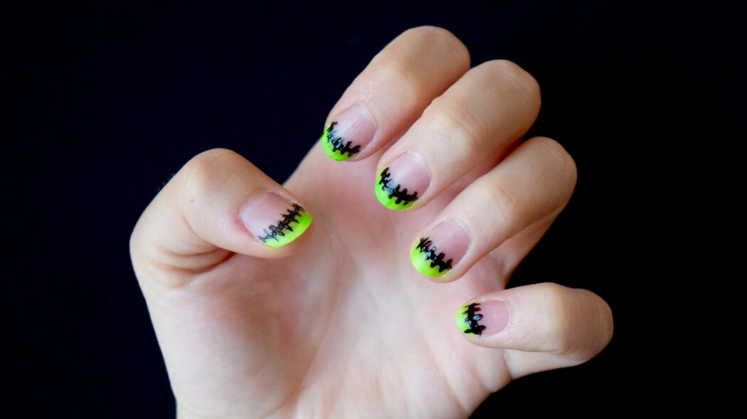 For this design you will need a toothpick and two colors — green and black. Start by sweeping a layer of color across the tip of your nail. If you’re using a neon green like this one, you may need to apply more than one coat. Next, dip your toothpick in the black polish and carefully trace a line underneath the green tip. Don’t worry if the line isn’t perfect — you can cover up any mistakes during the following step. Using the toothpick again, dab little stitches along the line you just traced. Allow time to dry and you’ll be looking franktastic in no time.