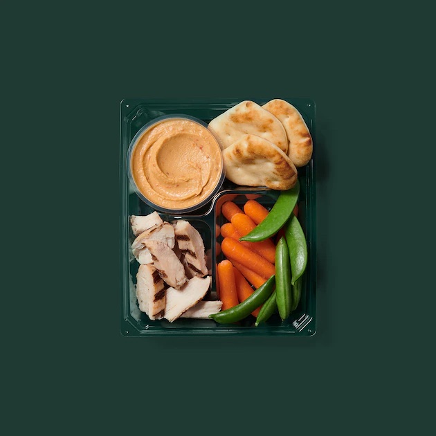 The Grilled Chicken and Hummus Protein Box is one of the better options when it comes to Starbucks’ prepared protein boxes. The chicken and hummus in the package provide 22 grams of protein, while the small slices of naan bread fulfill carb needs while keeping calories low. Fresh baby carrots and snap peas complete out the box and give it a nutritious boost.