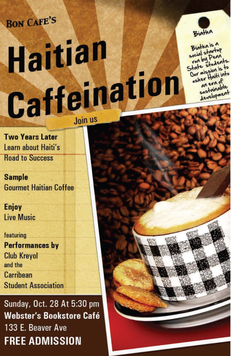 The event will feature an informative presentation on Haiti’s initiatives in sustainable business development (mainly coffee production), live music and dance performances by Penn State’s Club Kreyol and the Caribbean Student Association, all accompanied with delicious Haitian coffee. Admission is free and open to everyone.