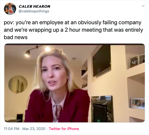 So, Ivanka donned her best pantsuit and posted a video from her home office. She used business jargon and motivational phrases to try to keep American spirits high. Twitter user, @calebsaysthings, decided the video could be quickly summed up with a popular Twitter format.