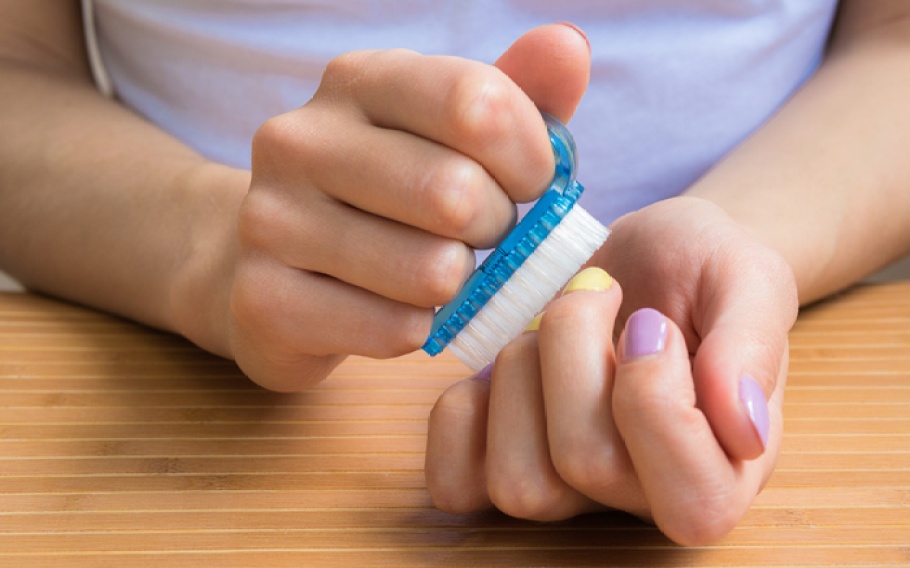 A nail brush is a brush that has the sole purpose of brushing away any bacteria and dirt from under the nails. VALLEY suggests using a nail brush over a pointy tool to get any dirt or gunk from under your nails. Using a pointy tool to get that dirt out will cause an increase in infection, so it is important to use a soft tool, like a nail brush, to gently get under the nails.
