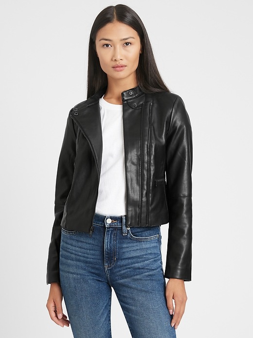 Leather jackets don’t have to be tough! Opt for a fitted, tailored one and color coordinate to your outfit for a casual, chic look.