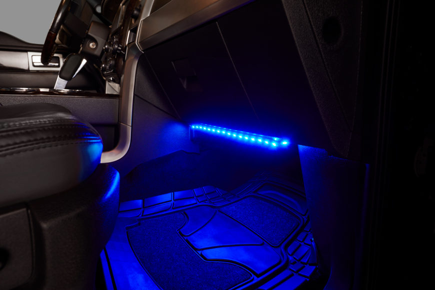 Starting off with a very classic and common form of car decor — strip lights are an easy way to immediately spruce up the inside of your car. Put them by the foot room, in the doors, and along the back to create a sort of ambiance. You can get them on Amazon and use AutoZone‘s DIY page to help with the installation.