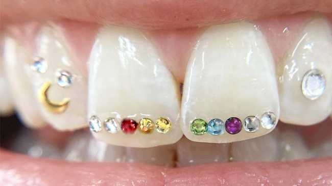 The temporary and non-evasive craze started in the early 2000s. Gems are attached to the enamel of the tooth, giving the smile a rebellious edge. For those getting tooth gems professionally attached, the process takes about 20 minutes and can last up to twenty-four months on the tooth.