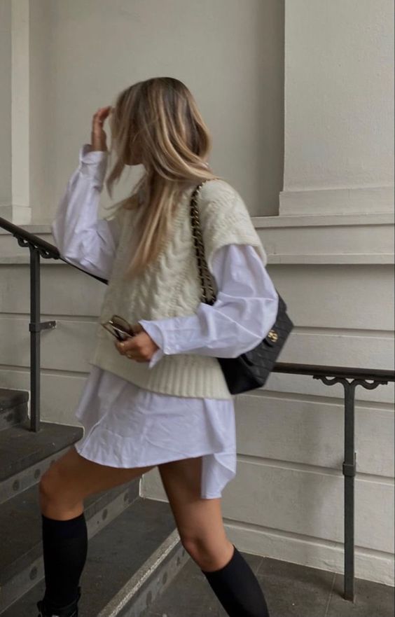 Sweater vests can be dressed up or down for any occasion. Above, the vest is styled with a button up underneath, which you see coming out from under. The black pants give this look a nice dinner look, with the converse dressing the outfit down to make it a bit more casual. The fall season calls for a lot of neutral colors, which is shown by the creme and white in the top, and the gray colored handbag.