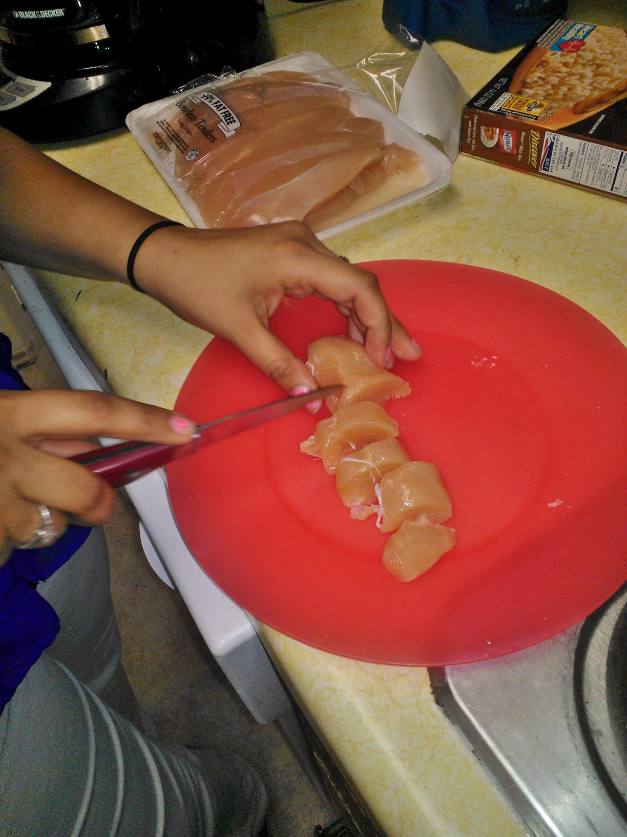 2. Chop up chicken and add to pot, stirring to coat meat with the mixture. Cook until browned.