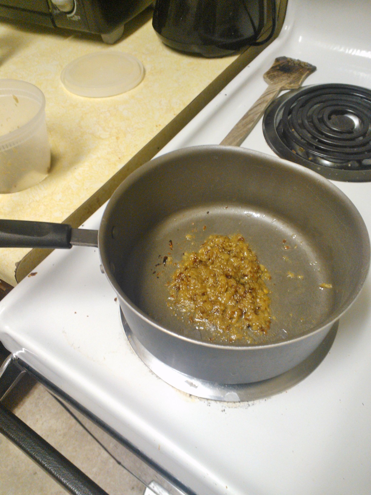 1. Using a small pot, brown onions, garlic and ginger in olive oil on medium heat.