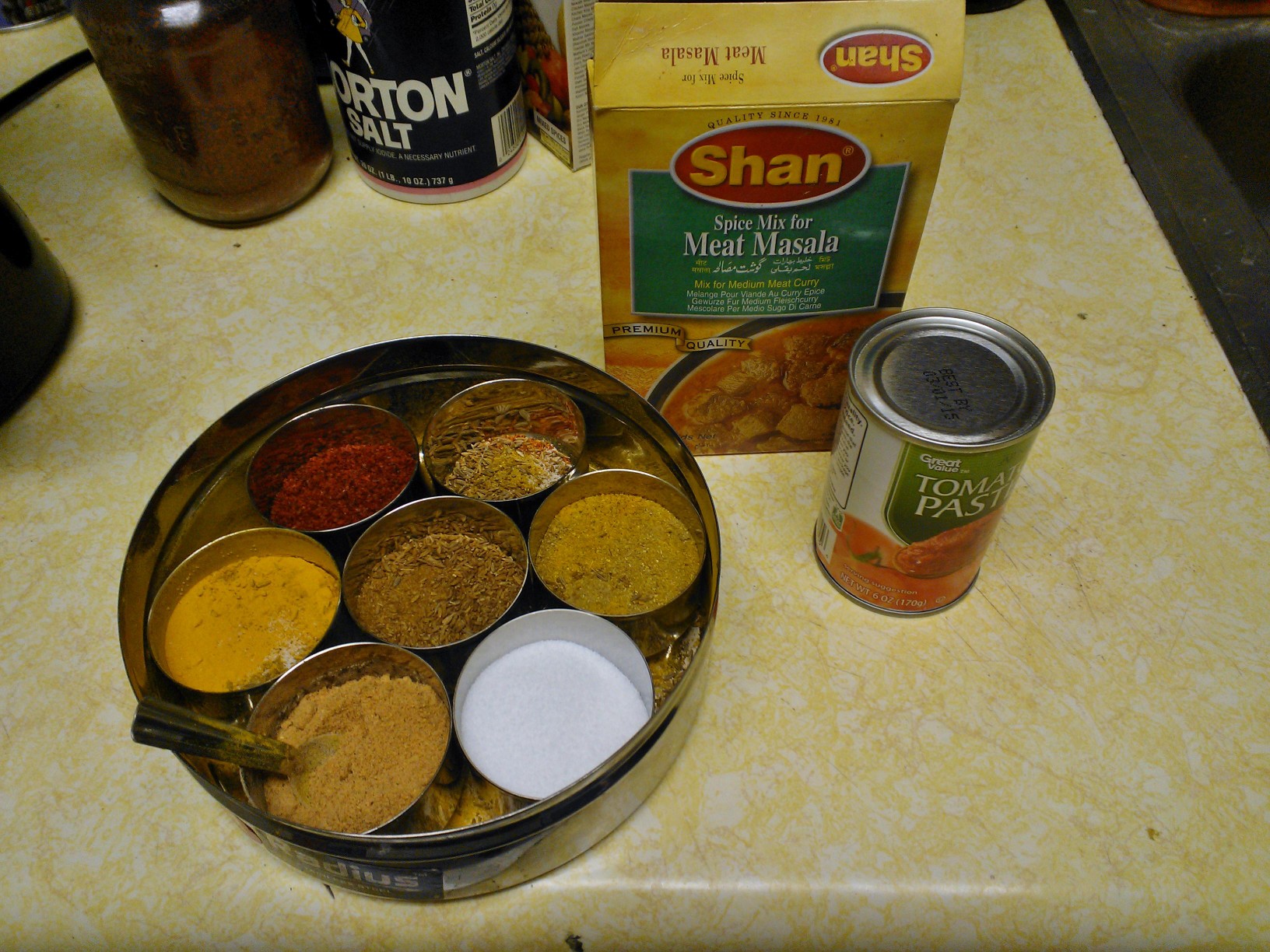 3. Add cumin, coriander, chaat masala (found at the Indian store) and two mini spoons of salt. Add 2 mini spoons of meat masala (found at the Indian store). Add 2 teaspoons of red chili powder for a spicier flare.