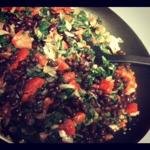 ¾ can of black beans. Beans have low carbohydrate content, high protein content, and zero sodium. (Woo, that means no bloating!) They’re a good replacement for a standard protein like meat, which can often contain fat. Be sure to drain and rinse before cooking- that liquid won’t do well in the peppers.
