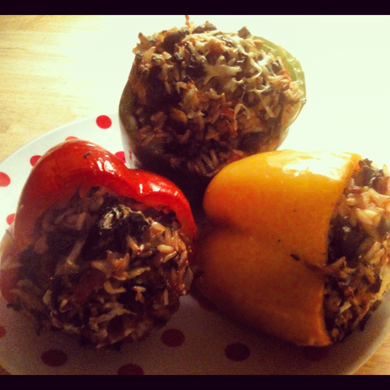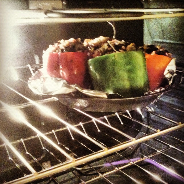 8. Place peppers standing up in baking pan. Sprinkle tops with any leftover cheese and bake for 35 minutes or until peppers start to soften.