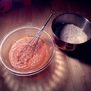 1. Whisk together wet ingredients in a mixing bowl, and dry ingredients in a separate bowl.