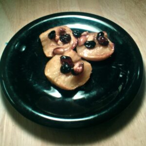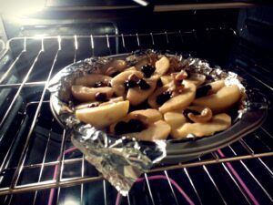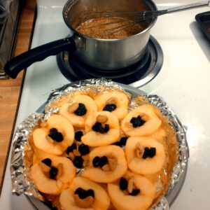 3. Cover casserole dish or deep pie pan with tin foil and evenly spread apples, core side up, around pan.