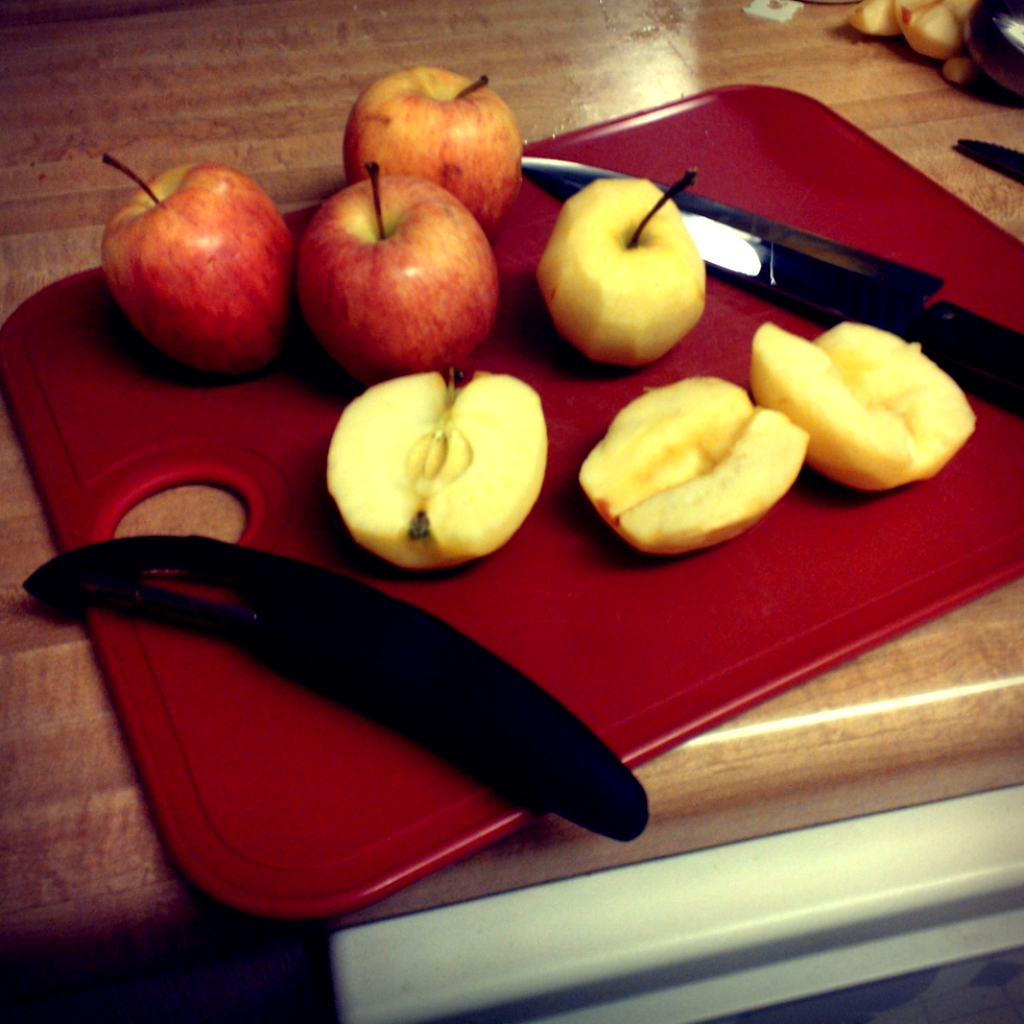 2. While the syrup simmers, peel apples, cut in half and use a pairing knife or melon baller to remove stems and seeds.
