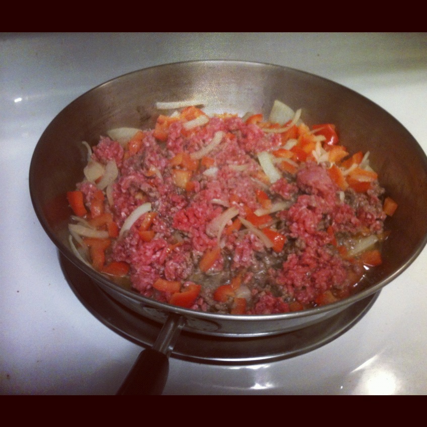 3. Add ground beef to pan and continuously use spatula to break up meat into smaller chunks.