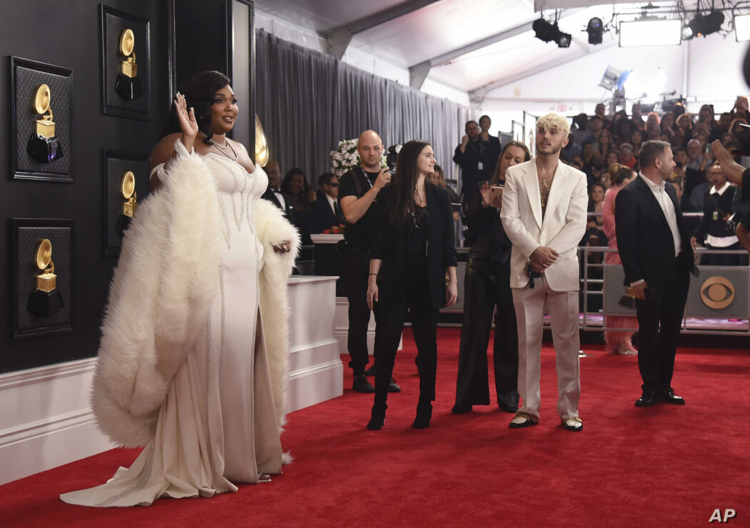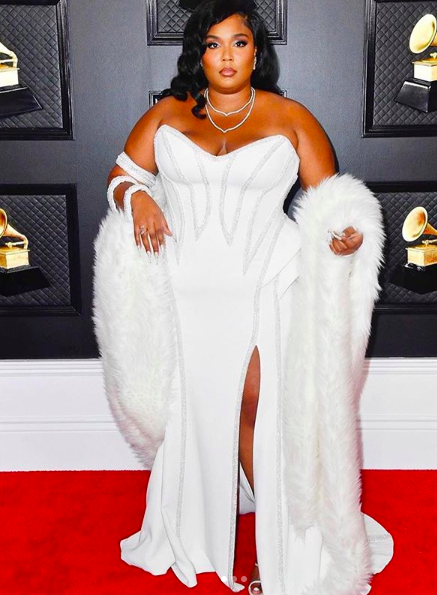 With a high-leg slit, embedded crystals and on-point accessorizing, Lizzo’s white Versace gown turned heads.