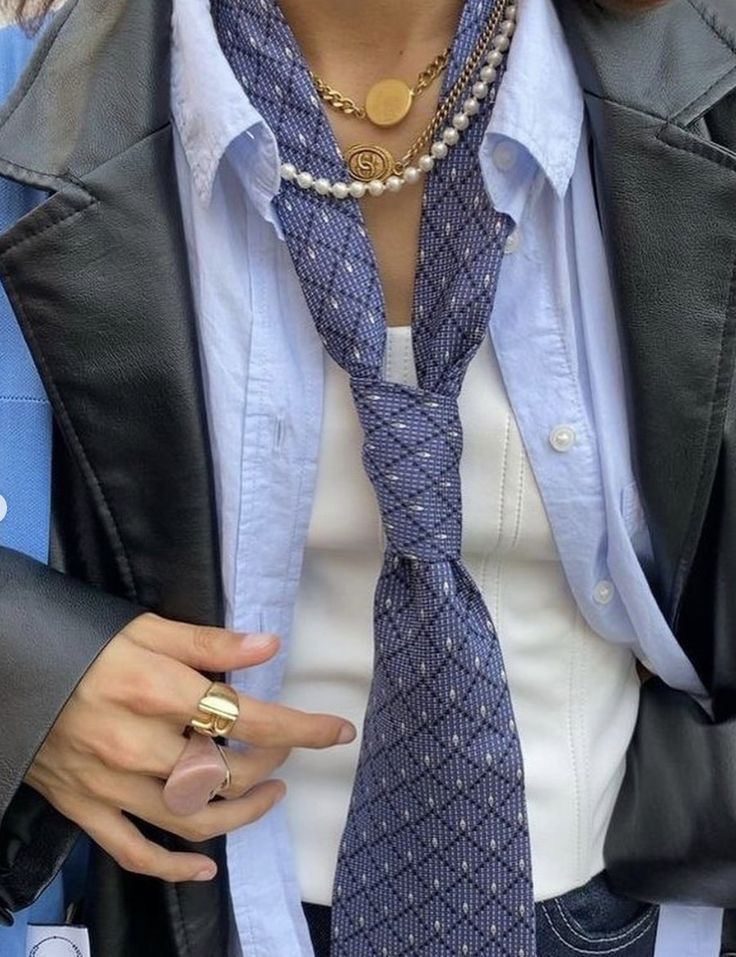 First of all, watch a YouTube tutorial on tying a tie. Do it a couple of times –– see how you like it. A tie is versatile. You can loosen it to give off a more casual, Serena van der Woodsen look, or tighten it up to a collared shirt to make an outfit more formal.