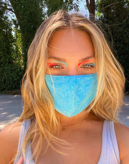A solid mask collection should include the basic solid neutral colors such as black, white and gray for throwing on with any outfit. But including some lively colors and patterns can make your mask the focal point of the outfit. A vibrant eye look that plays off the colors in the mask can create a whole outfit in and of itself. Maddie Ziegler proved this true by pairing a bright aqua mask with a simple white tank. With the colors of the mask also present in her makeup, it instantly becomes an effortless statement look.