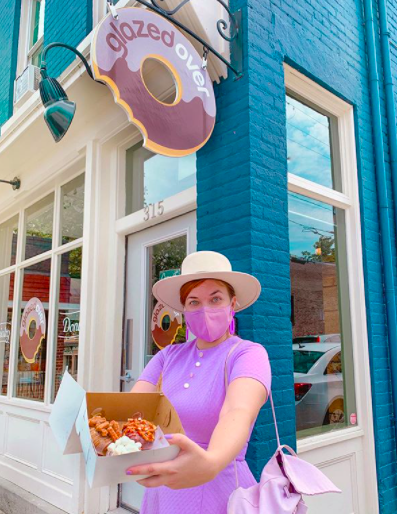 The little effort that goes into incorporating a cute mask into your outfit can truly make-or-break your look. Influencer Katherine Oxman’s lilac themed post on Instagram is cohesively pulled together with a matching mask that plays off of the colors of the donut shop sign as well as her outfit. Finding matching masks is also being made even simpler now with online retailers such as Forever 21, Etsy and Revolve selling a matching mask set with clothing, scrunchies and even dog bandanas for when you want to match with your pooch.