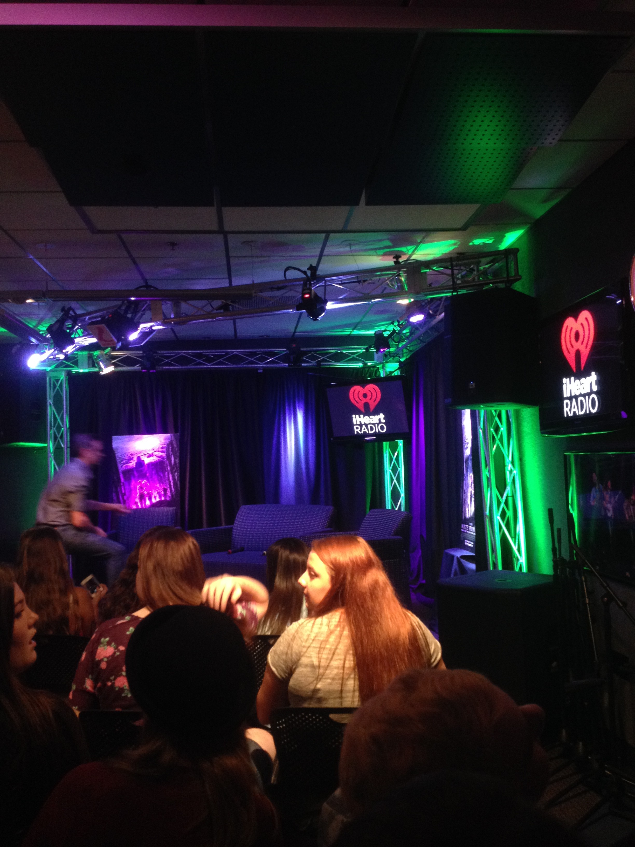 One-by-one we were called to confirm our identities, and then lined up to enter the room where they would actually be interviewed. The room was seriously gorgeous. There were green and purple lights everywhere, cameras, a green room, and a very small stage with four chairs. We sat in the very back, but our view was still decent.
