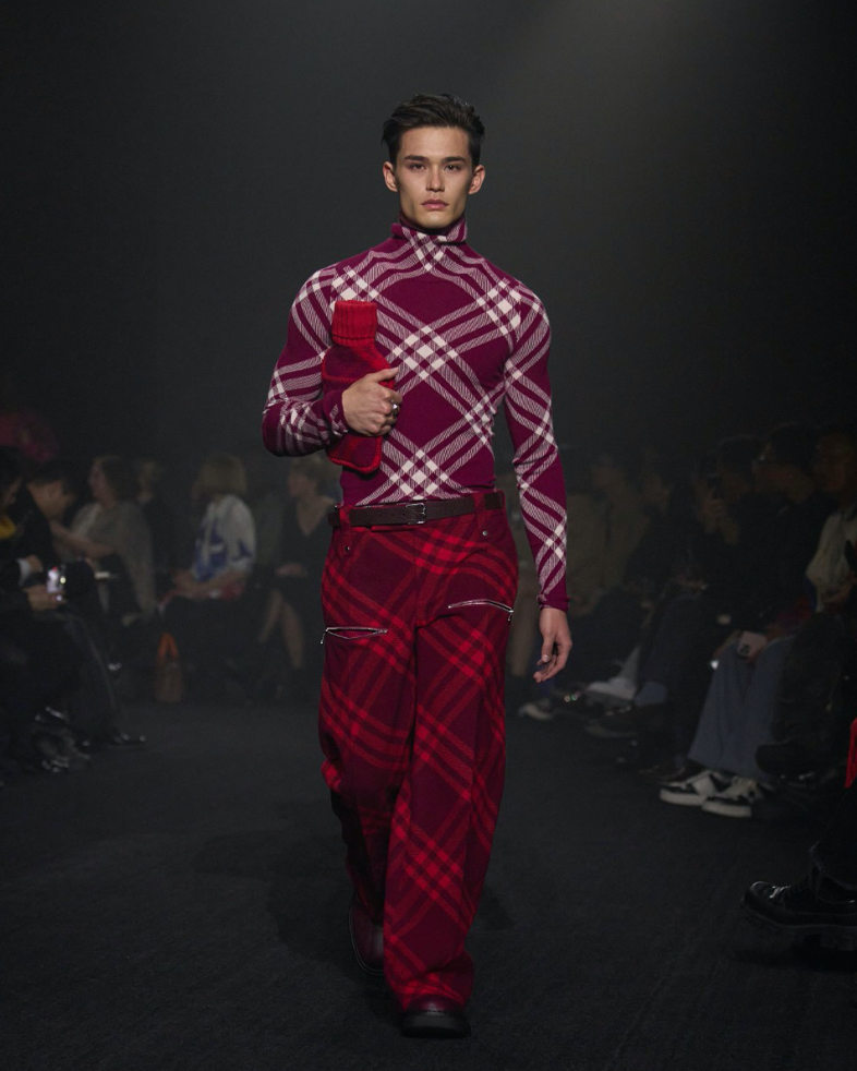 Models were observed trekking Lee’s Burberry runway in lush knitwear, adorned with the Burberry check monogram in a rotated orientation. The pattern was also seen in a deep violet, which isn’t a color Burberry is known for using.