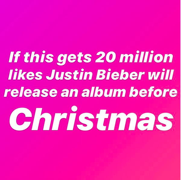 On Oct. 27, Justin Bieber shared a post to his Instagram account promising to release a new album before Christmas … under one condition: 20 million likes.