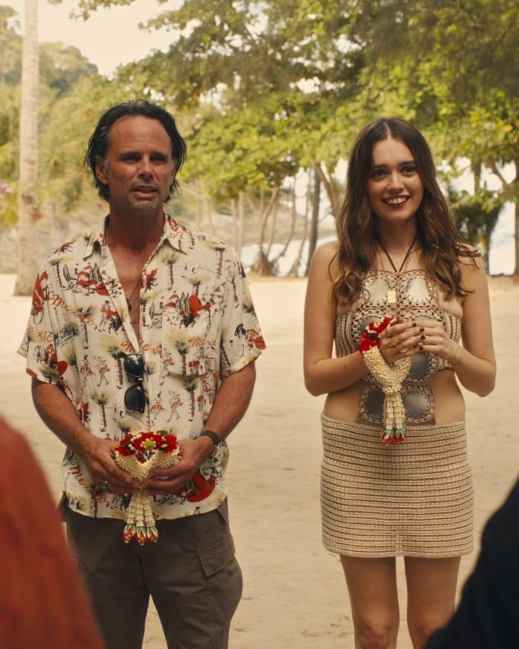 The show’s costume designer, Alex Bovaird, turned to the French designer Jacquemus for custom looks for Chloe. With her interesting and confusing backtory, custom designer clothes make perfect sense for her character. All of her outfits this season scream poolside and are perfect for the resort and her boyfriend’s yacht.
