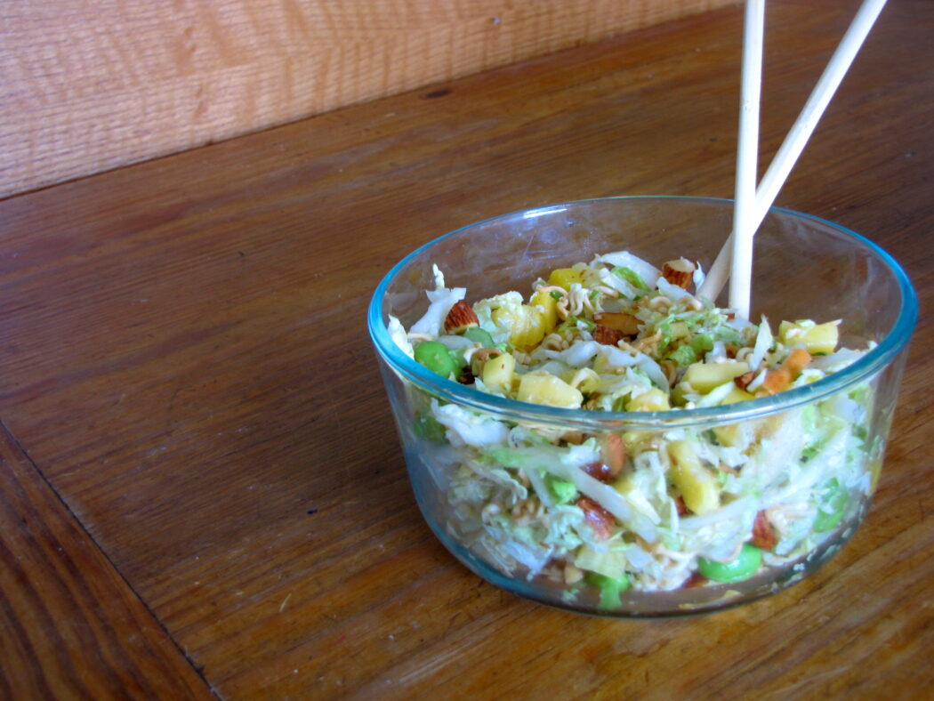 2. Combine the rest of the ingredients in a large bowl and mix together. Add the ramen and almonds and continue to toss. Then add as much or as little dressing as you want and pat yourself on the back for making your ramen noodles as healthy as possible.