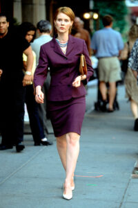 Your style represents your strength and determination. Miranda is the strongest character on Sex and the City in that she’s very focused on her work, but also knows how to have a good time. As a lawyer, she must dress business-professional for every work-related meeting or event, but she does it in style. If you’re wondering how to dress for a day at work, but to also prepare for a night out, think a tight-fitting, subtly bright suit with a statement necklace or pair of earrings. That way, you’re ready for dinner and drinks with your friends once that eight-hour workday comes to an end.