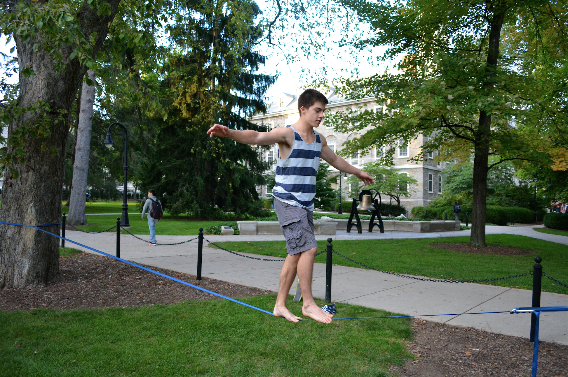 It’s easy to assume the circus has come to town when you spot a group of students taking turns teetering across what can only be described as a tightrope tethered between two trees on Old Main lawn, but when it comes to writing them off as another campus oddity, Dear Old State’s resident slackliners ask that you cut them some slack.
