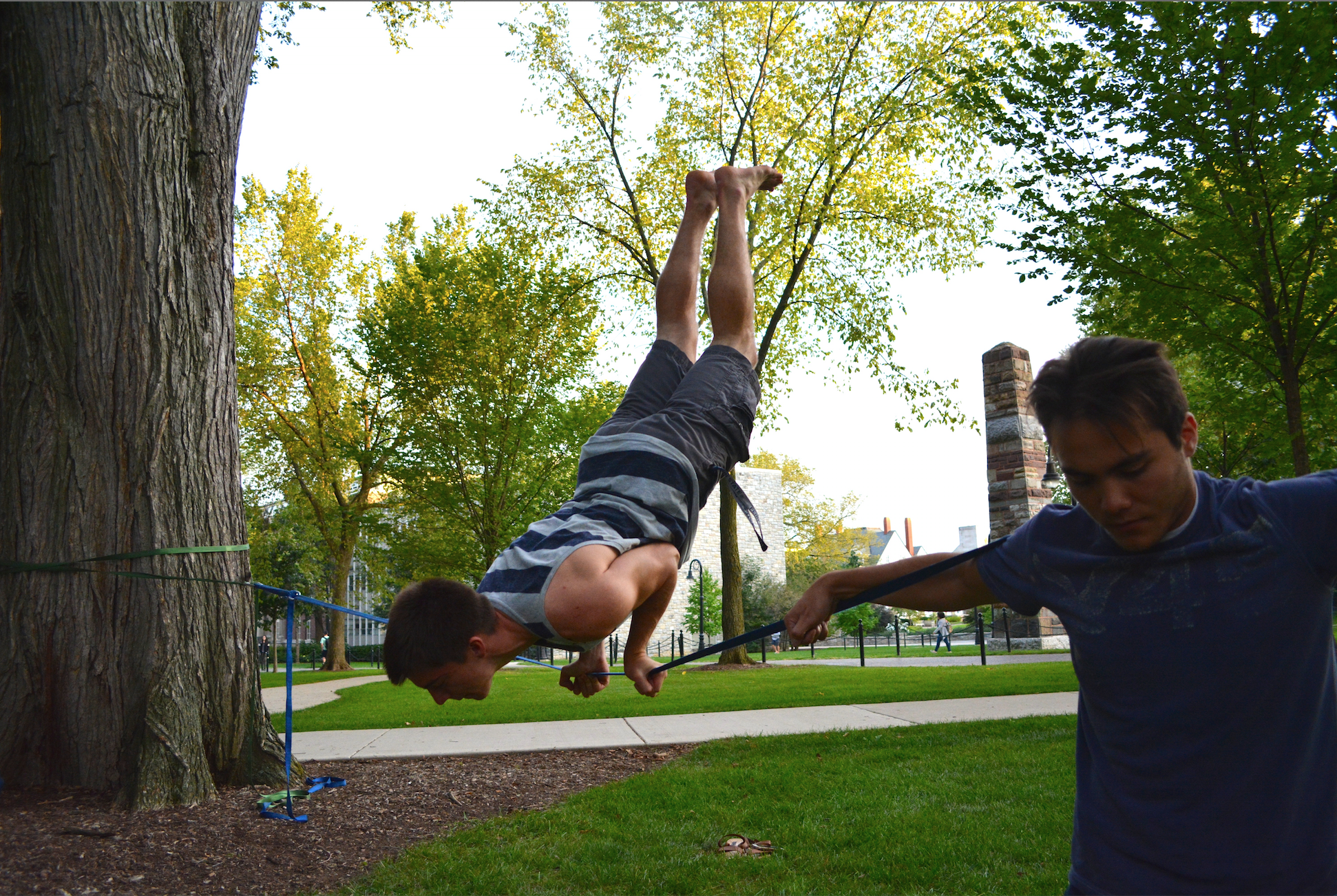 “Everybody should come out and try it,” says junior Nick Nader, one of the university’s many, though often overlooked, slacklining fanatics.