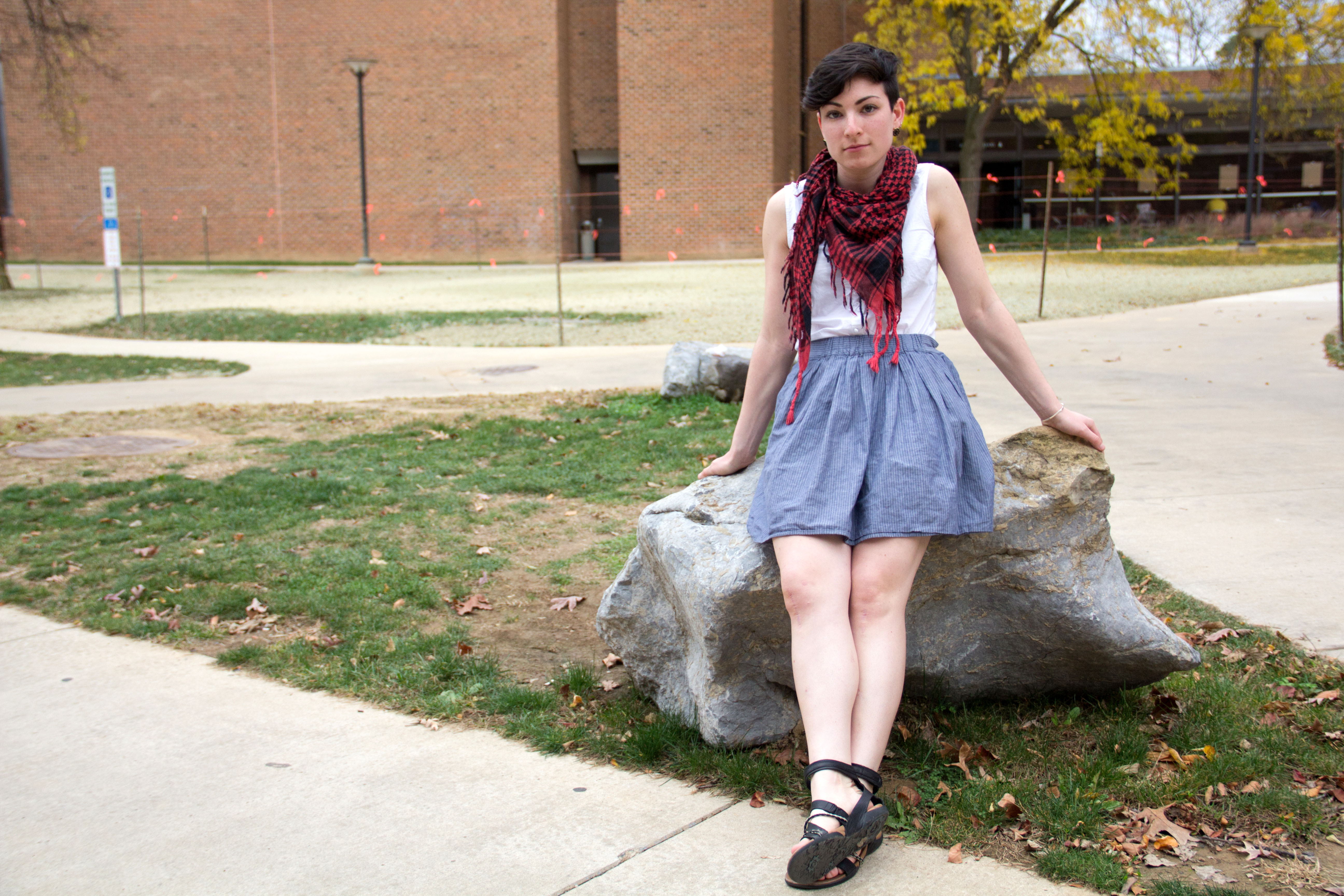 What She’s Wearing: Scarf, her local Goodwill, $3; Shirt, J Crew, $20; Skirt, J Crew, $20; Sandals, Merrell, $80