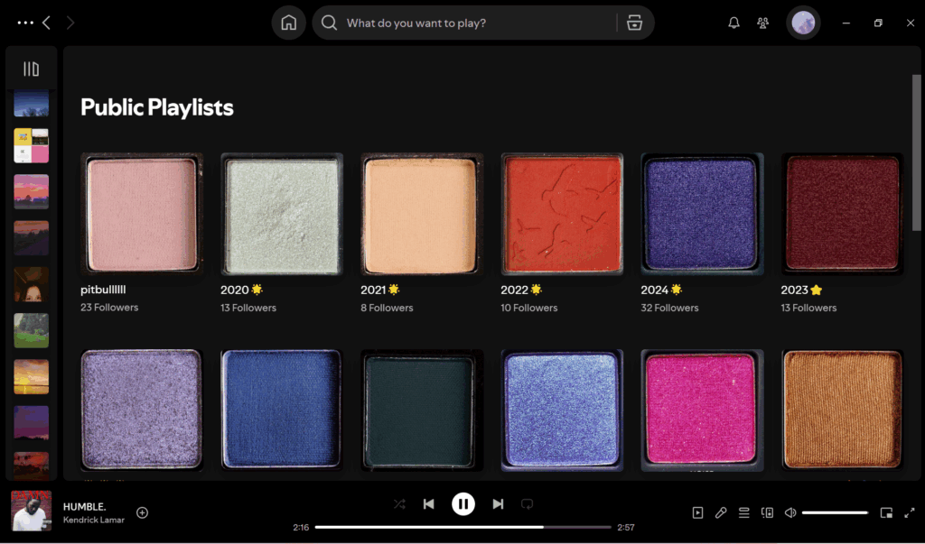 Recently, people online have stylized their Spotify playlists to look like eyeshadow palettes by making each playlist cover a different eyeshadow pan. Colors can represent so much as many people learned from “brat summer,” the “Barbie” movie and “Wicked”. This makes it easy to decide which eyeshadows to represent a playlist. For your party girl playlist featuring Kesha and Charli xcx, try a vibrant glitter shadow. Have a Sunday cleaning playlist? Try a soft and calming pastel shade. The possibilities are unlimited.