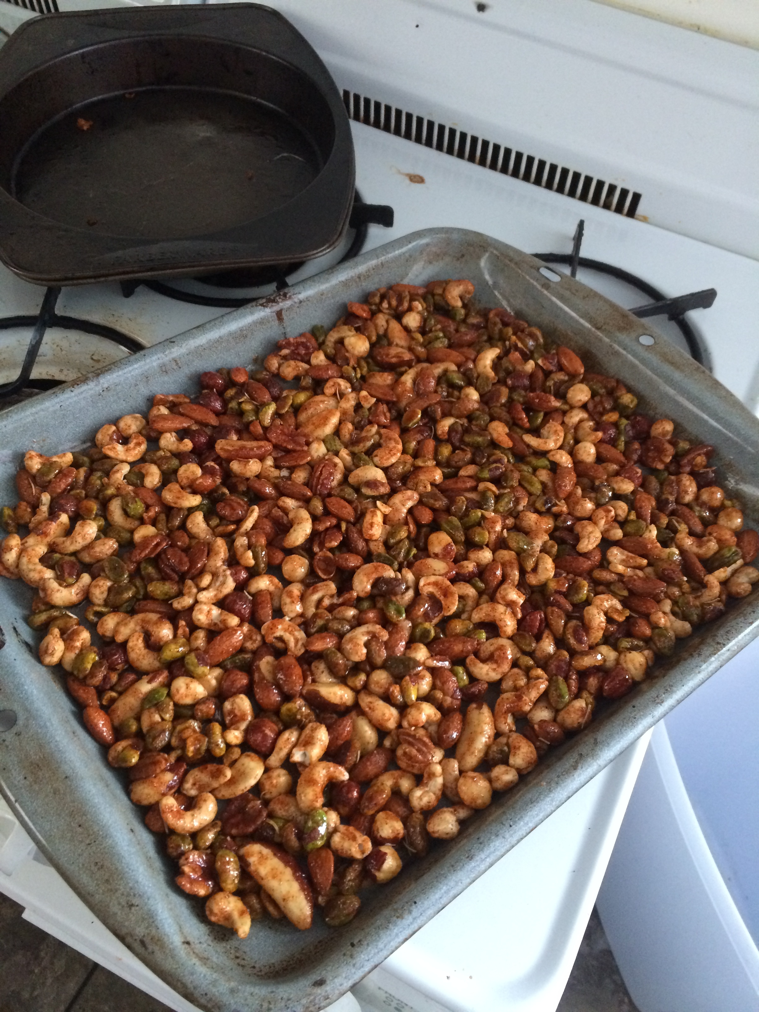 6. Spread the coated nuts onto your greased baking sheet.