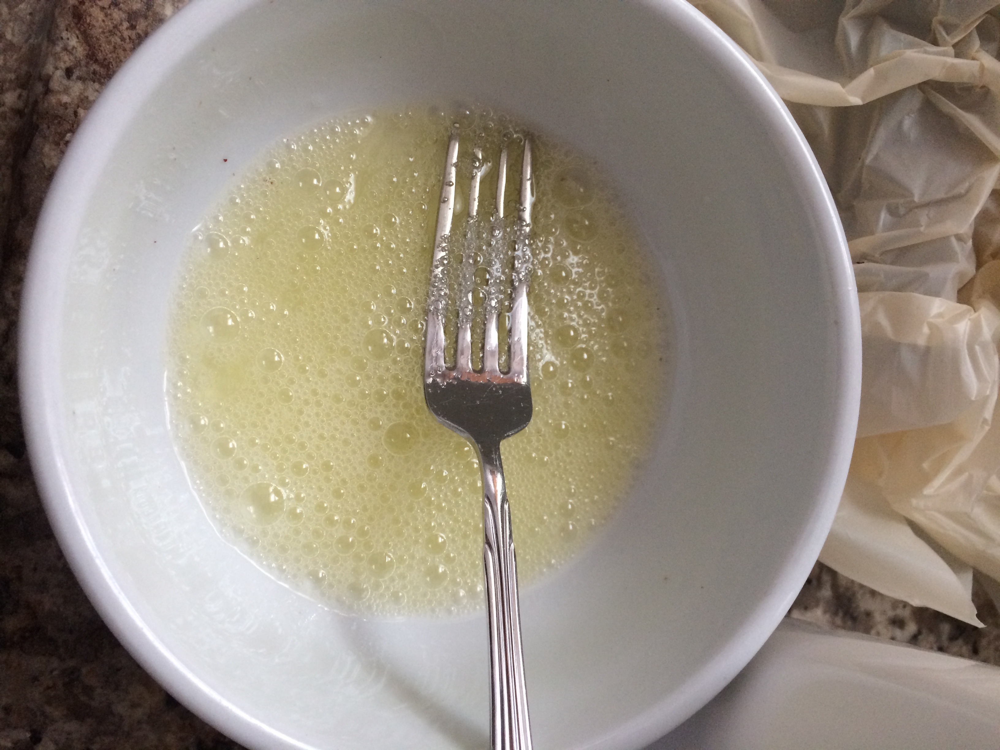 2. Beat two egg whites until foamy. There are a few ways avoid the egg yolk. I cracked the egg and let the egg whites drip out while pouring the egg yolk back and forth between the two eggshell halves.