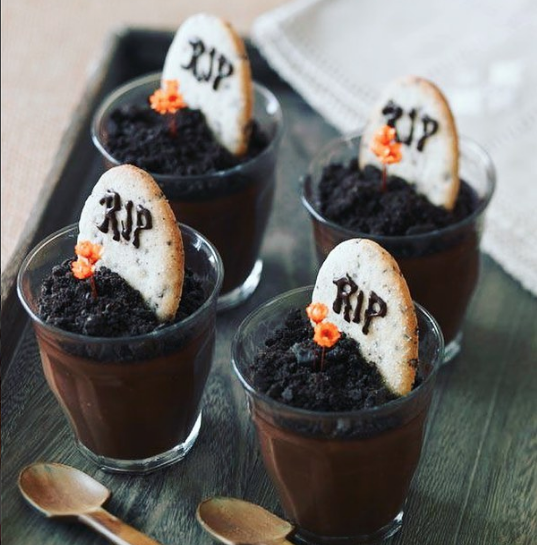 - Dip the Milano cookies halfway vertically to add gravestones to complete your graveyard.