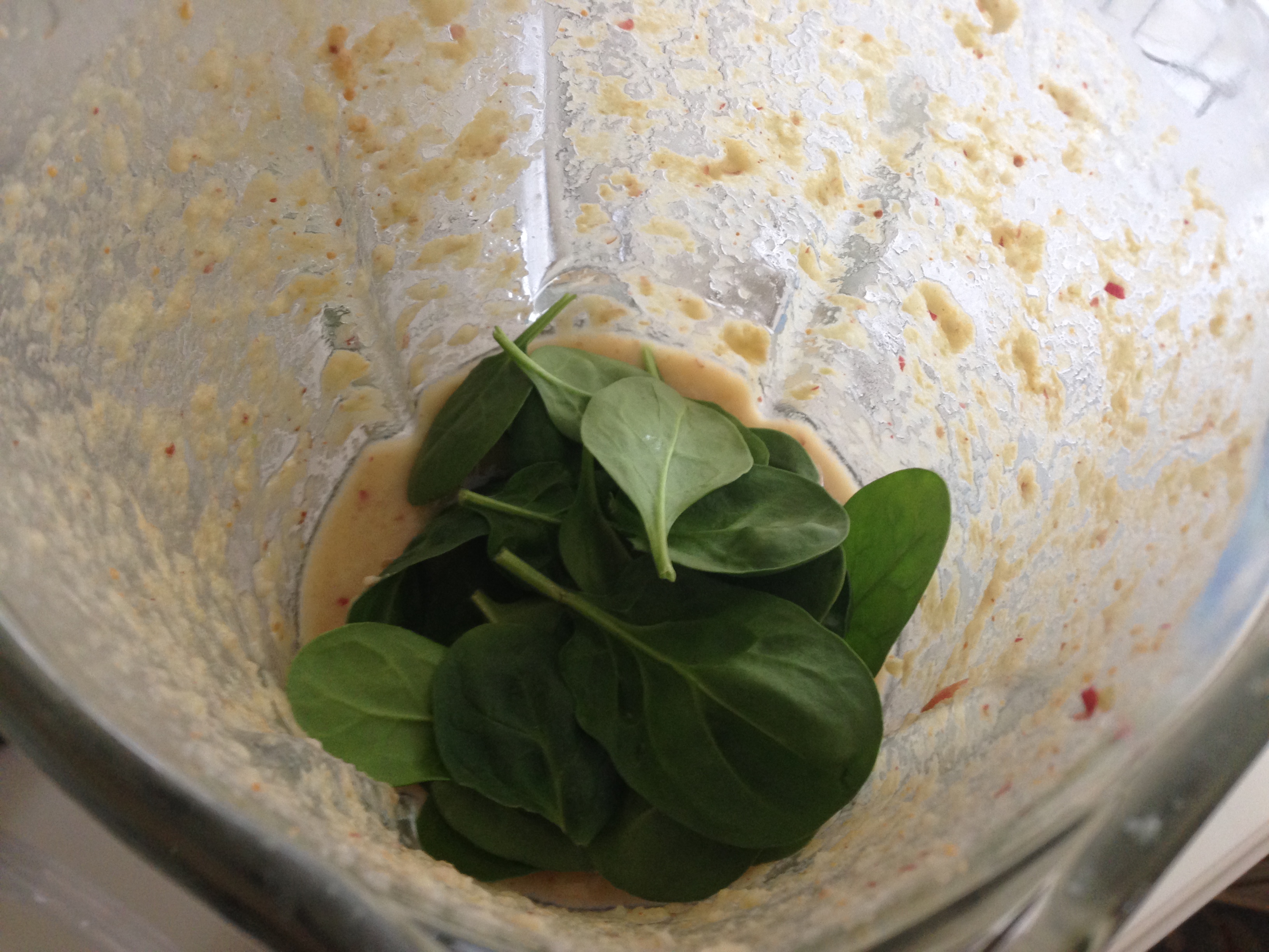 4. Add the handfuls of spinach and kale. Blend until there are no more visible pieces of leaf.