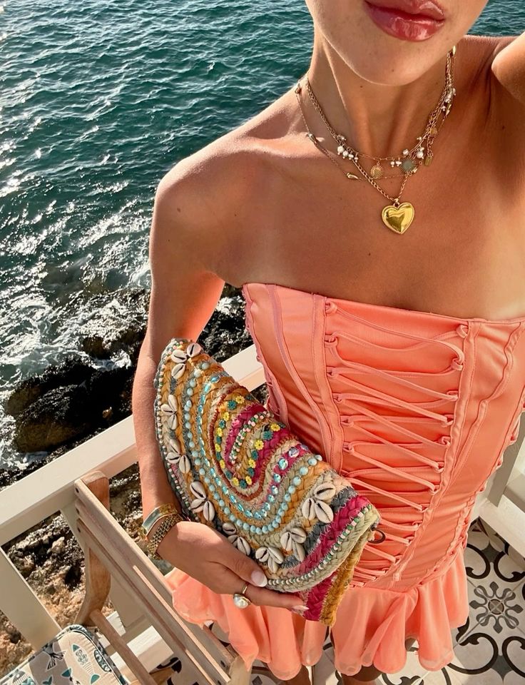 A perfect outfit isn’t complete without trendy jewelry and accessories. Statement necklaces, especially those in gold, enhance tan skin and add an effortless element to the look. Popular statement necklaces right now feature geometric shapes and charms. Pairing these necklaces with unique earrings or delicate rings will elevate your outfit even further. Additionally, be sure to shop for stylish purses that complement simpler looks, as seen above.