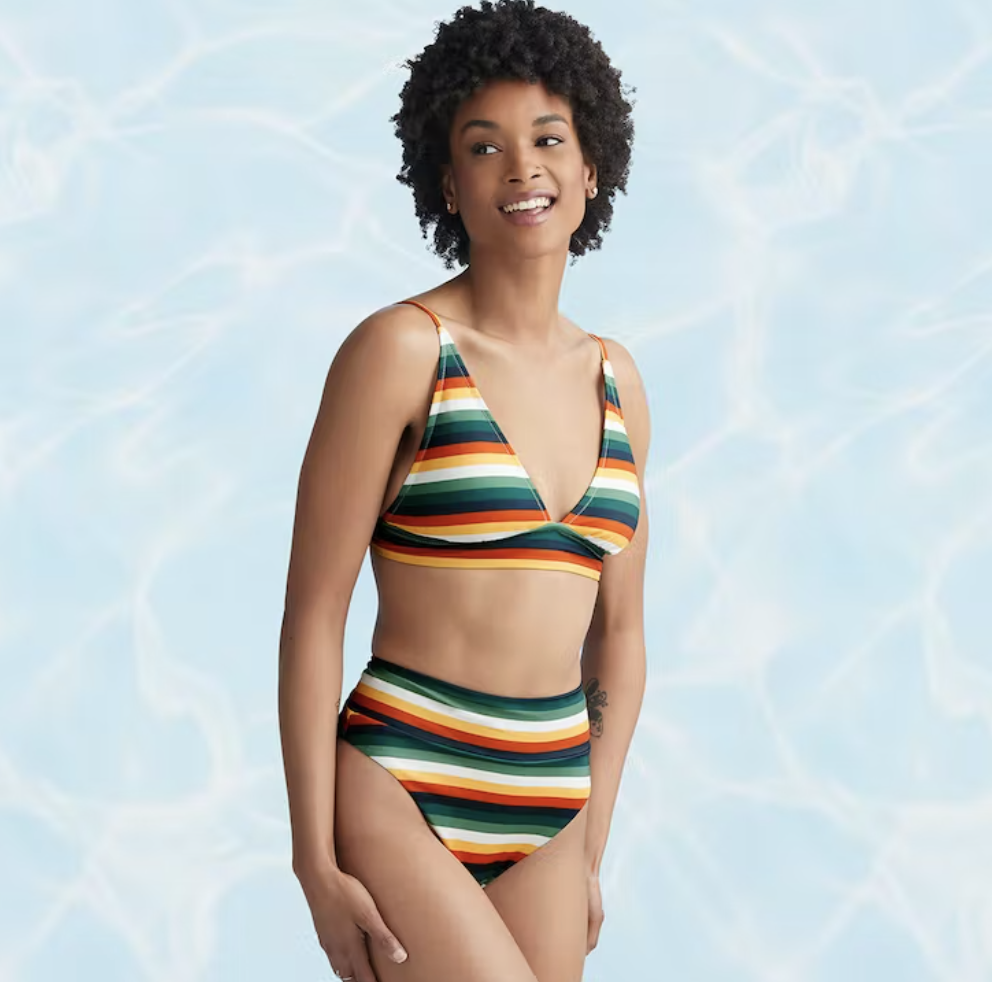 This brand specializes in swimwear with more simple styling and earthy tones. They’ve got high waisted bottoms, scoop neck tops, and classy one-pieces. All of their clothing is made from recycled materials, keeping the planet alive and happy. Currently, bottoms are starting at $33.00 and tops are starting at $39.00.
