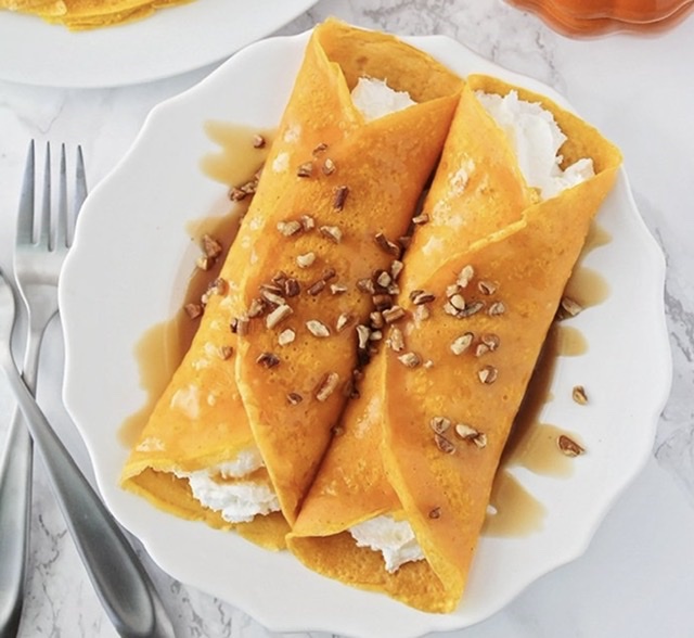 With fall suddenly upon us, what greater way to usher in the season than with a pumpkin flavored dessert? This crepe is the the perfect dose of pumpkin, balanced with a sweet cheesecake filling, topped with caramel and nuts.