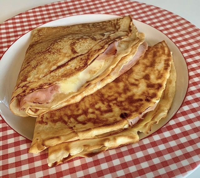 - Add your choice of cheese and ham on half of your crepe. This would also be the time to add your other ingredients if you want. Fold in half, then fold in half again and plate to serve! You could also easily wrap this up and eat it on the go!