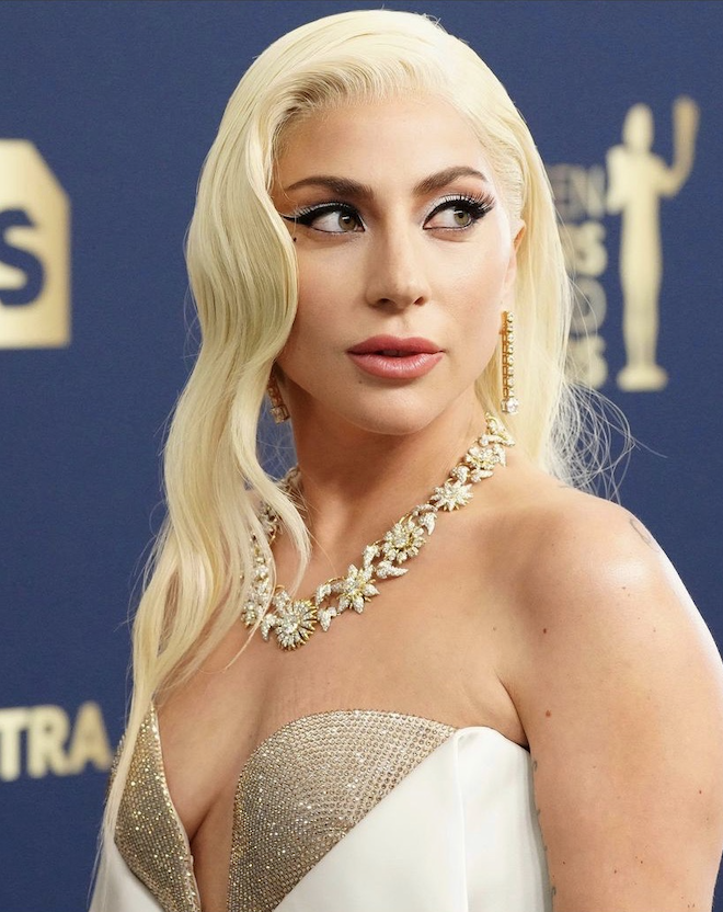 Lady Gaga has brought us quite a few eye-popping looks over the years, and once again she did not fail to impress. The singer-turned-actress wore an Armani Privé gown with stunning Tiffany and Co. Jewelry. The bedazzled gaping neckline of the dress makes a gorgeous statement, complimented by her silver eyeshadow and diamond jewelry. Overall, Gaga owned the red carpet with this totally regal look.