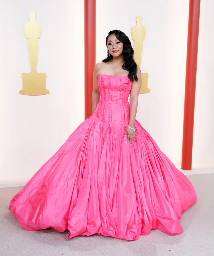 The Best Supporting Actress nominee (who starred in “Everything Everywhere All at Once”) was another big color winner on the carpet when she arrived wearing a breathtaking strapless pink gown by Valentino. The pink number — from Valentino’s Spring 2023 couture collection — featured a structured bodice and a giant bubble hem that drew attention from everyone on the carpet. Hsu accessorized her outfit with silver drop earrings and a matching bracelet, allowing the dress to truly shine.